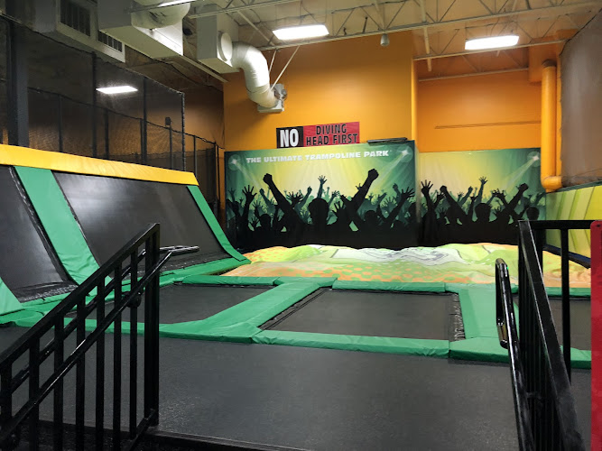 Indoor trampoline center featuring an open jump arena, a foam cube pit, dodgeball & basketball.