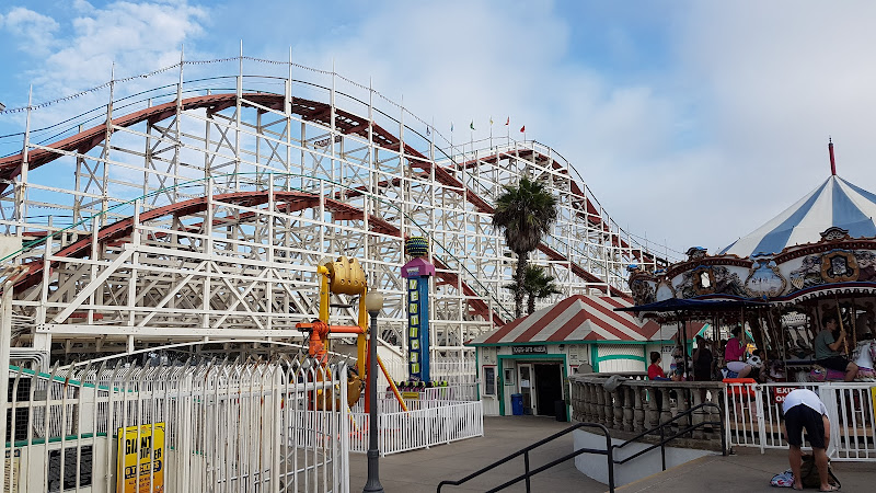 Vintage games, gift shops, rides & an iconic wooden roller coaster right next to the beach.